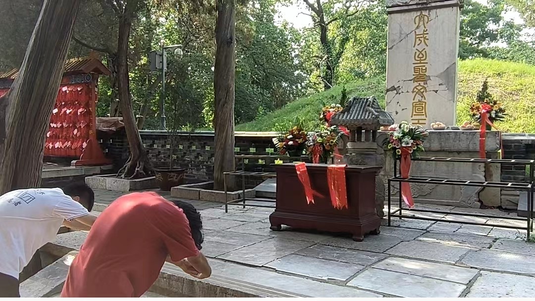 7月6日,团队成员们前往第三站——孔林。进入林园,讲解人员带着团队成员游览了孔林景观,沿途介绍了相关历史和人文故事,团队成员先后祭拜了子贡、子路和孔夫子之墓。深入林中,只见墓冢累累,碑碣林立,还尚存有李东阳、严嵩、康有为等明清书法名家的亲笔题碑,每一块碑刻都镌刻着后人对先贤的敬仰与追思。成员纷纷表示能感受到那份跨越时空的敬畏与传承。