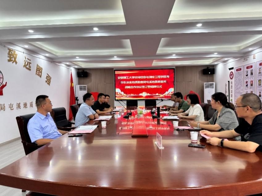 8月13日上午,空间信息与测绘工程学院副院长王磊一行4人赴华东冶金地质勘查局屯溪地质调查所(简称“华冶局屯调所”)走访调研并签订战略合作协议。华冶局屯调所所长秦建芳、副所长方涛、综合办副主任张玉玲、测绘院院长黄政、测绘院高级工程师江传奇等出席了会议。会议由方涛主持。